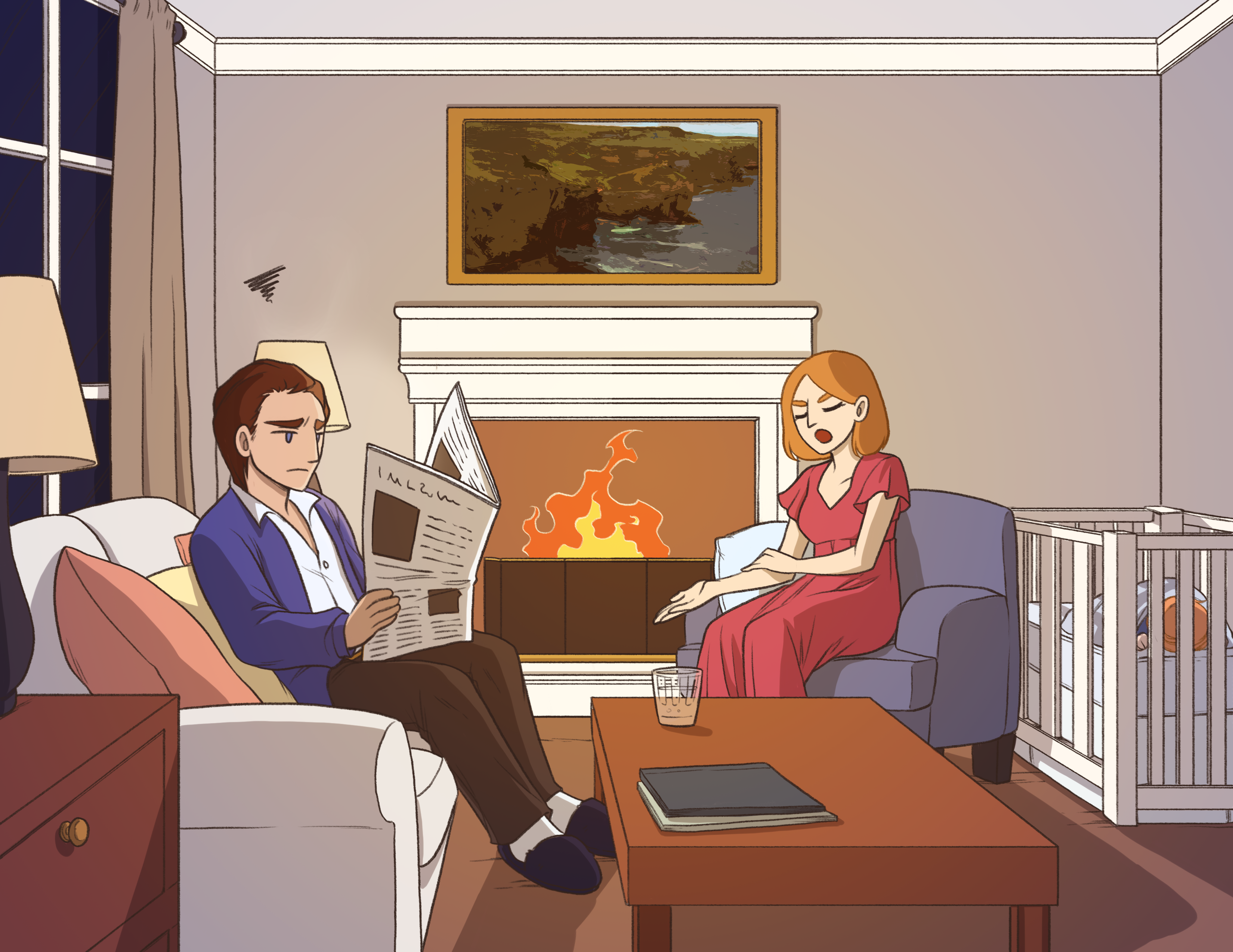 Lánúin cois tine tráthnóna. 🔊✎
