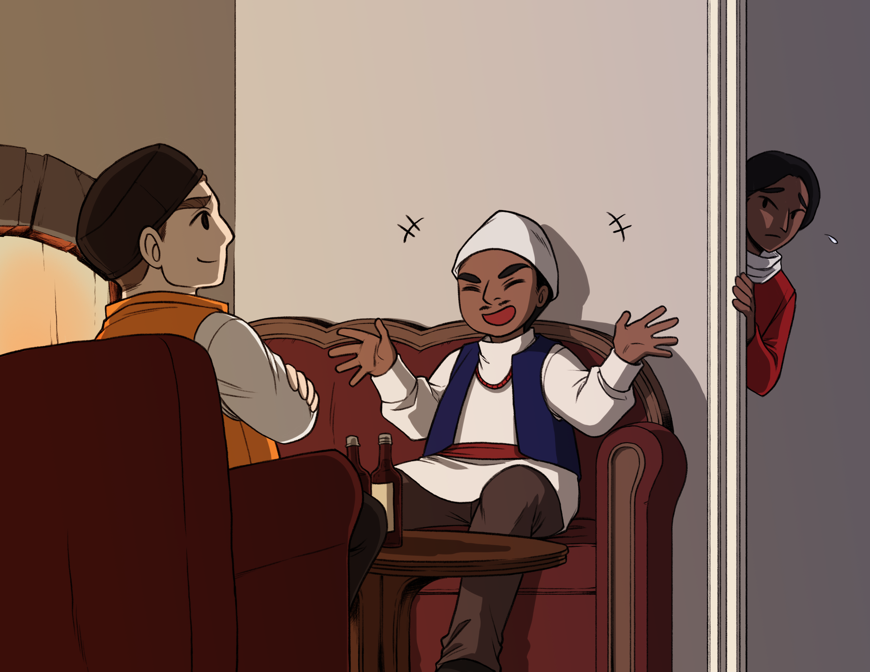 Ba léir go raibh lúcháir ar an fhear eile mé a fheiceáil ag teacht ar ais. 🔊✎ Shocraigh sé mo chathaoir san áit ba theolaí an teas. 🔊✎ Shoiprigh sé na cúisiní go cúramach. 🔊✎